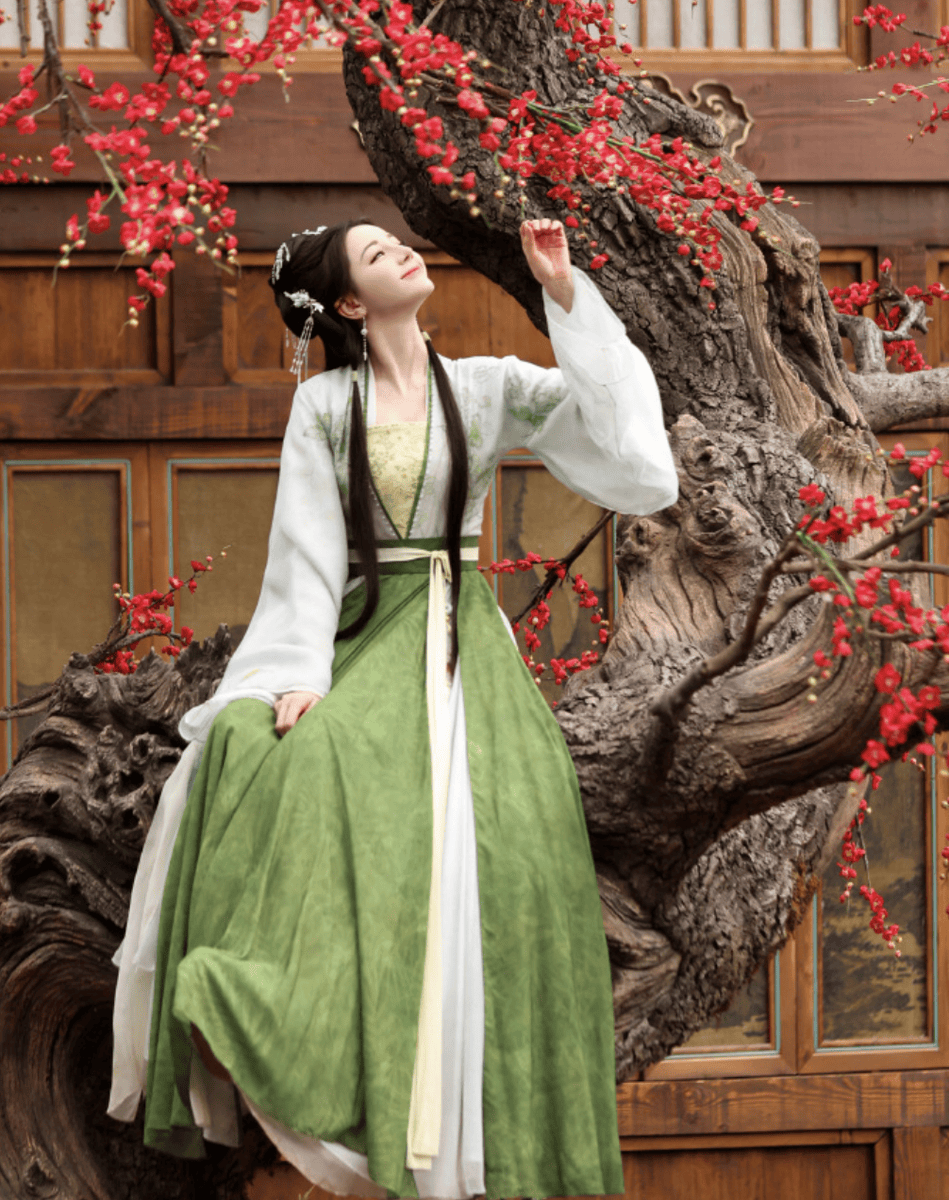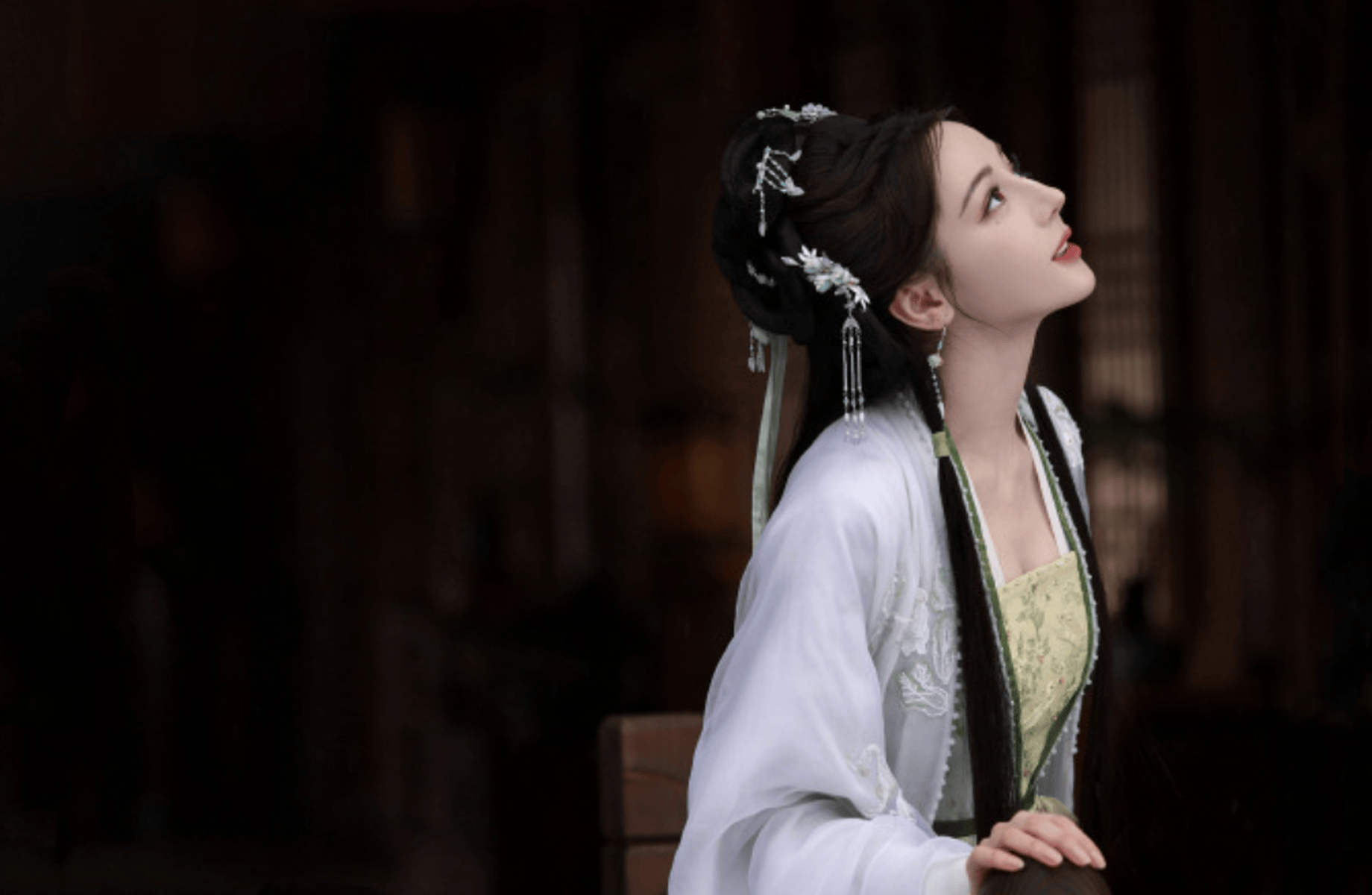 剧照的造型设计尽显巧思,摒弃了繁复堆砌的装饰,以“天然去雕饰”的质感勾勒出古典雅致。一袭月白纱裙轻盈飘逸,裙摆处点缀的细碎银线在光影下若隐若现,行走间仿佛有月光流淌,广袖轻扬时又添几分仙气氤氲。发型打理得简洁大方,青丝仅用一支素玉簪固定,耳畔悬着小巧的珍珠耳坠,随动作轻轻摇曳,既凸显了脖颈的纤细柔美,又衬得整个人清丽脱俗。妆容更是贴合“清雅”主题,清透底妆搭配低饱和豆沙唇色,眼尾以浅淡黛色勾勒,没有浓墨重彩的修饰,却让她的五官轮廓愈发精致,尽显温婉气质。
